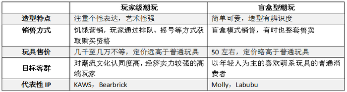 根据产品定位的差别,潮流玩具可分为高端玩家级潮玩和盲盒型潮玩两大类。玩家级潮玩通常由知名艺术家设计,有些甚至由艺术家亲自制作,艺术性较强。这类产品大多限量发行,某些特别款式需要玩家通过排队、摇号等方式获取购买资格。饥饿营销方式使得玩家级潮玩的入门门槛较高,只有愿意在潮玩上花费大量时间和金钱的人才能“入坑”,这也使得玩家级潮玩相对“小众”。