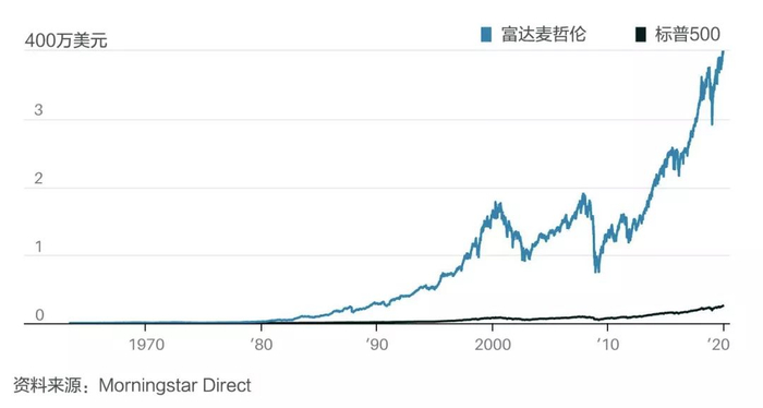 在彼得·林奇接手之前,富达麦哲伦是一只成功但规模不大的基金。投资者在该基金1963年设立时投入的1000美元在林奇1977年接手时变成了11478美元,在他1990年退休时增长至306033美元。麦哲伦基金最近几年在多次管理层变动后有所下跌,但是最初的投资者如果一直投资于该基金,那么如今的回报会超过400万美元。