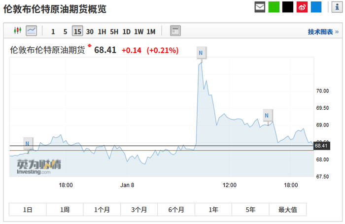 伦敦布伦特原油开盘后直线拉升,随后回落,截止发稿,每桶报68.41美元,涨0.21%。
