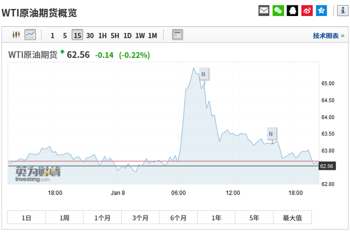 WTI原油一度短线拉升近5%,最高触及65.48美元/桶,截至发稿,WTI原油由涨转跌,跌幅0.22%,报62.56美元/桶。