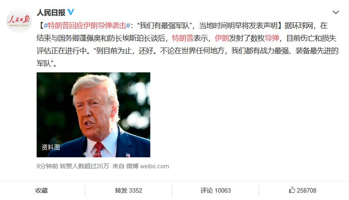 在伊朗对伊拉克境内的美国军事基地进行导弹袭击后,特朗普发出推文称,明早(北京时间今晚)他将就此事发出正式声明,正在进行损害评估。“伊朗对两处伊拉克境内的军事基地发射了导弹。到目前为止情况还好,正在进行损害评估。我们拥有世界上最强大、装备最精良的军队。明早我将发出正式声明。”他写道。