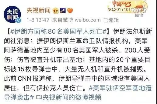 据央视新闻,作为对美军打死伊朗军事指挥官卡西姆·苏莱马尼的报复行为,伊朗伊斯兰革命卫队今天先后向多个驻伊拉克美军基地发起两轮导弹袭击。