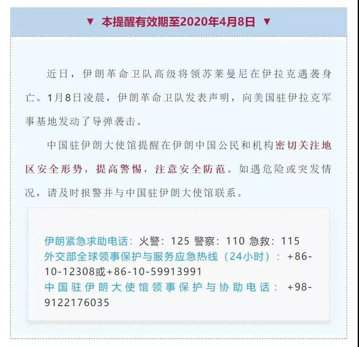 中国驻伊朗大使馆提醒在伊朗中国公民和机构密切关注地区安全形势,提高警惕,注意安全防范。如遇危险或突发情况,请及时报警并与中国驻伊朗大使馆联系。