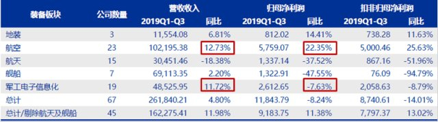国防军工行业不同子行业2019Q3业绩汇总