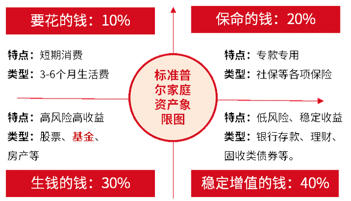 标准普尔家庭资产象限图非常流行,但也存在不合理的地方,比如它没有讨论配置资产的基数,毕竟大部分家庭配置资产的重头还是房产,按照四象限的比例,只用家庭30%的资产去配置房产明显是不可行的,但我们仍然可以学习它的思路。
