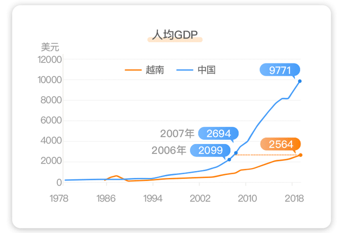 胡超:越南人均GDP目前仅为2564美元,相当于中国2006-2007年的水平,并且其城镇化进程、人口红利、对外开放、吸引外资等发展路径和模式与中国非常相似,2018年越南GDP增幅7.08%,在发展中国家中位居前列,越南正接近经济腾飞的起点。