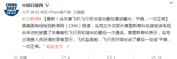 据中国日报网,美国有线电视新闻网(CNN)报道,乌克兰外交部长普里斯泰科在接受该电视台采访时披露了失事客机飞行员和塔台的最后一次通话。普里斯泰科表示,乌克兰调查人员获得的录音显示,飞机坠毁前,飞行员对塔台说了最后一句话"平稳,一切正常。"