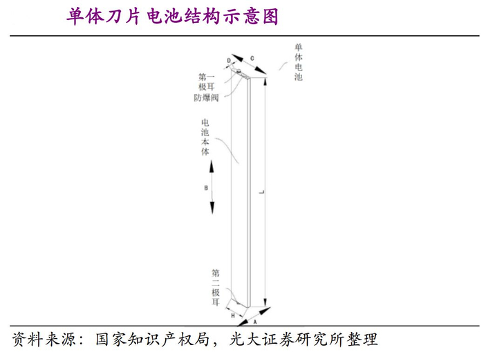 比亚迪的“刀片电池”将电芯在一定体积下合理扁长化,兼具提高电池能量密度及增加电芯散热面积的优点,由于电池较传统方形电池更加呈现“扁平”和“长条”形状,故称为“刀片电池”。根据国家知识产权局比亚迪专利显示,“刀片电池”长度最长可以达到2500mm,是传统普通磷酸铁锂电池的10倍以上,极大的提升电芯的成组效率,并且是可以基于不同需求调节尺寸的一系列电芯。