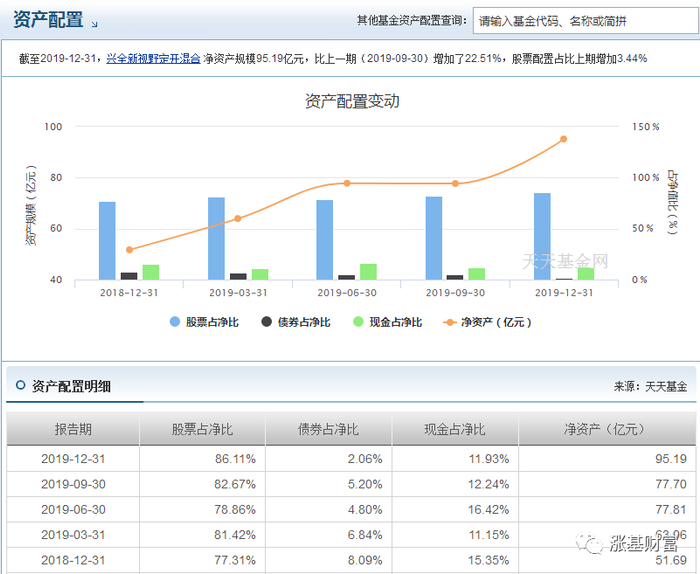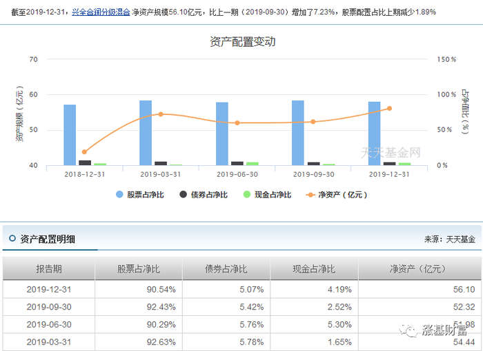 再来看看兴全新视野的资产配置情况,仓位有小幅上升,规模在2019年基本也翻倍了。