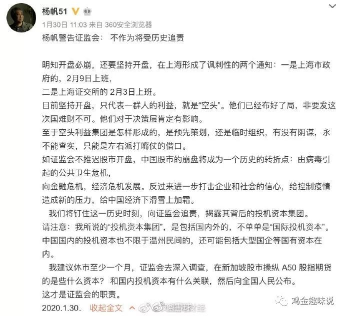 但昨日,政法大学的一位教授发了条微博,大致意思是“鉴于疫情严重,可能导致股市开盘后大跌,因此建议股市不要在2月3日开市,而是继续休市一个月”,一石激起千层浪。