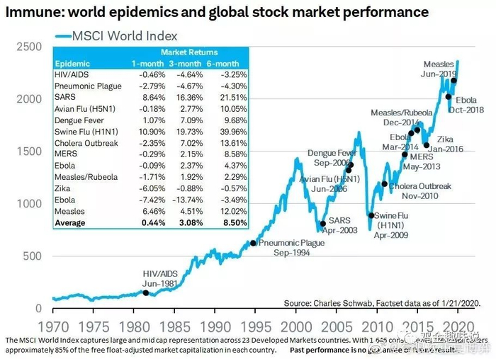 下图为反映全球股市的指数(MSCI World Index)在历次疫情爆发时的表现。从数据上看,历次疫情爆发后一个月内股市的表现不好,但是3个月和到6个月之后的表现还是很不错的。而且2003年的非典赶上了经济复苏,反而成了市场的底部。