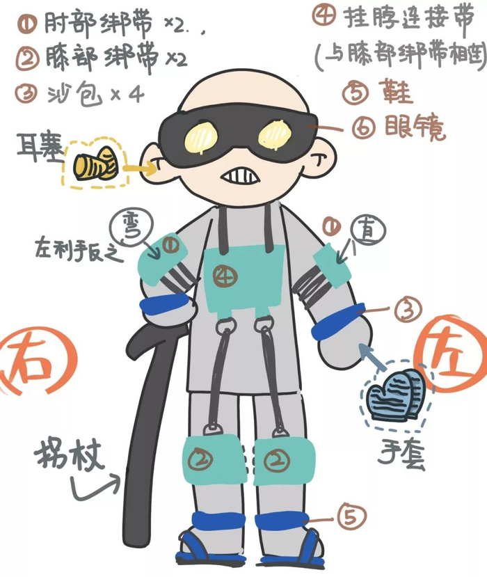 穿上这套装备后,能够明显感觉到指关节的灵活性变低,听不清高音频的声音,视线模糊,视野狭小。负重拖鞋、曲背用围兜、负重脚腕带,让人行动缓慢且费力。
