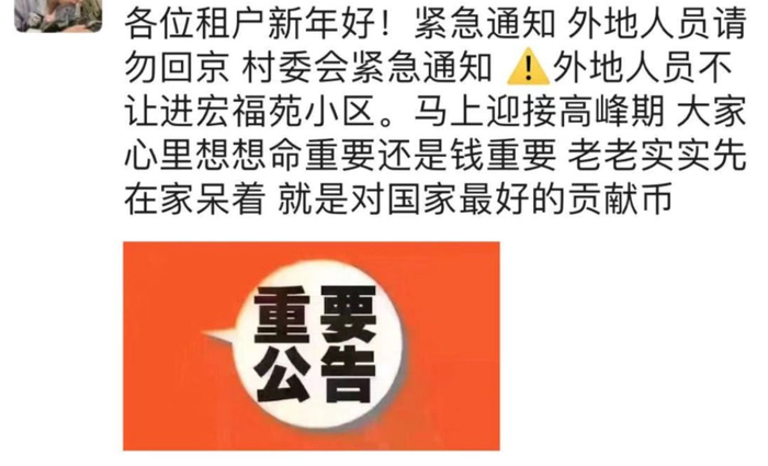 我本来订的是2月1号的返程高铁票,但昨天(1月30日)早上7点的时候,收到了房东发给我的村委会发布的紧急通知,说从1月29日20:00起,所有外地返京人员及车辆都不能进村,必须在外面隔离14天、并出示在京14天身体健康证明,才能进村。