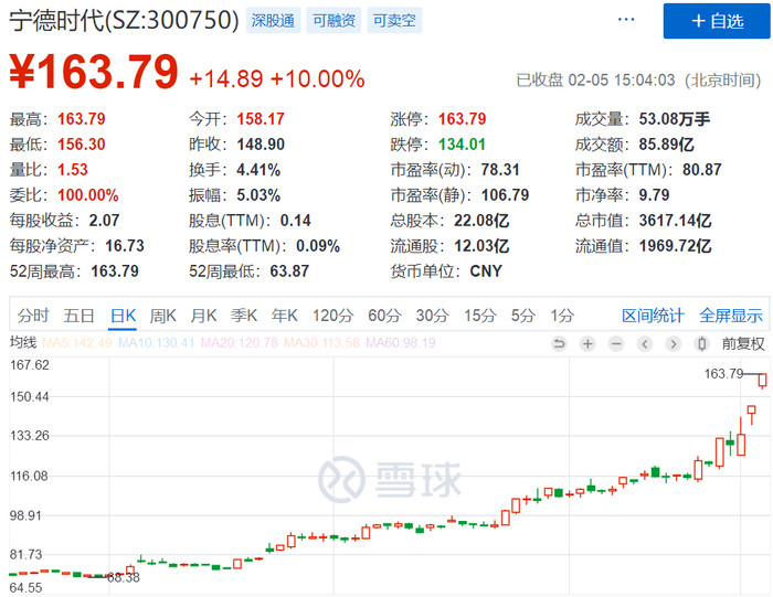 同时,伴随着特斯拉的狂飙,A股新能源行业巨头—宁德时代(300750)亦不惧疫情影响,鼠年的前3个交易日,斩获2个涨停,累计涨幅达25.4%。