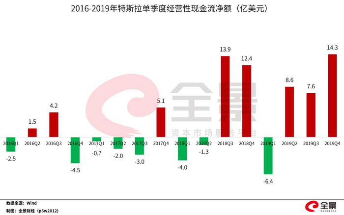 更为重要的是,2019年第四季度,特斯拉的经营性现金流高达14.25亿美元,创下历史最好水平,更是首次出现连续3个季度经营性现金流为正。