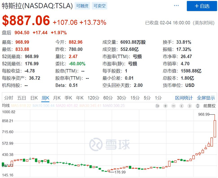 刚刚和中国完成牵手,特斯拉便开启了一轮酣畅淋漓的暴涨。继2月3日暴涨20%后,2月4日,特斯拉一度涨超24%,股价一度冲击969美元,逼近1000美元大关。