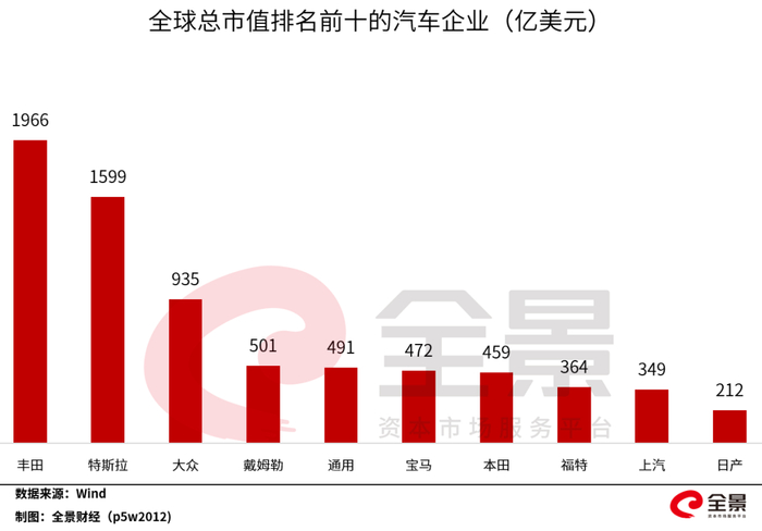 据Wind数据统计,目前汽车制造行业中,总市值排名前十的车企分别为:丰田、特斯拉、大众、戴姆勒、通用、宝马、本田、福特、上汽、日产。