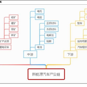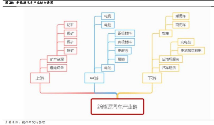 新能源汽车产业链分为上游、中游、下游。上游主要包含以锂、钴为代表的原材料和锂电设备;动力电池、驱动电机、电控构成的动力系统是整车的核心部件,即中游;整车制造、充电桩及运营、租赁等共同构成新能源汽车产业链的下游。
