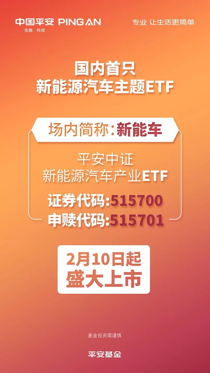公开资料显示,国内首只新能源汽车产业主题ETF——平安中证新能源汽车产业交易型开放式指数证券投资基金(下称“平安中证新能源汽车产业ETF”,交易代码:515700)将于2月10日正式登陆上海证券交易所。