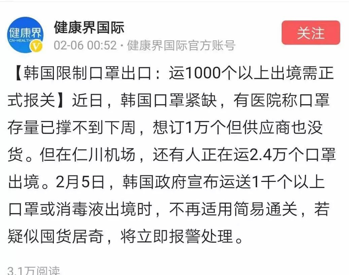 目前韩国也有疫情发生,大量的购买和囤积,导致韩国的医院也出现了口罩紧缺的状况。而代购人员把大量的口罩从韩国运走,也引起了政府的注意,韩国政府及时出台政策,金额超过1.2万元或者数量超过300个,就要申报出口手续。而只要在申报审批上做出限制,就能限制住出口数量。