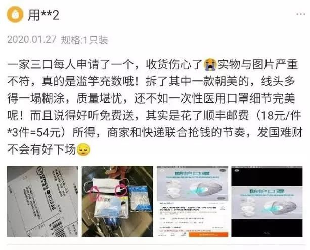 而有一些比较鸡贼的互联网公司,为了获取更多的用户,采用了免费送口罩的套路,免费收割了大量的用户。而付出高额快递费的用户,换来的却是一个劣质的口罩。