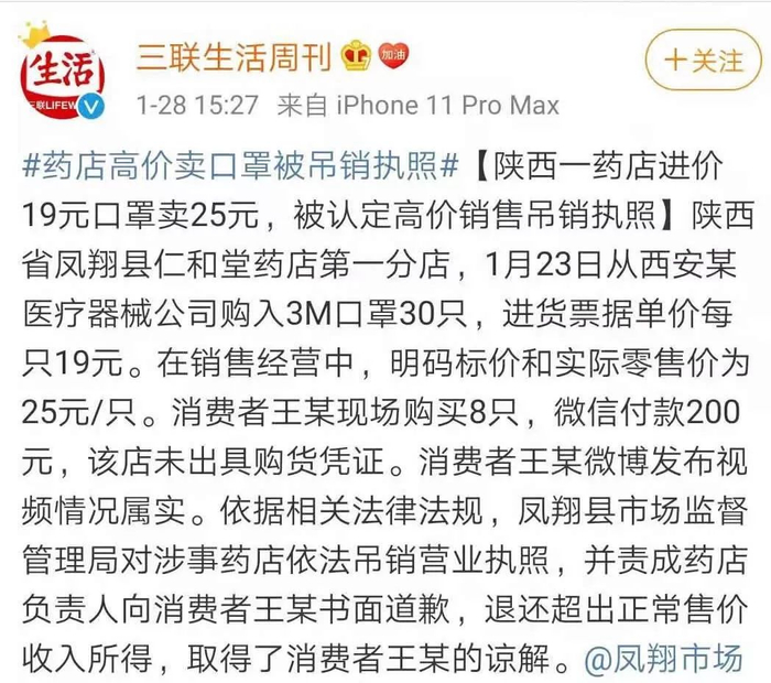 因为药店老板手里的这批口罩,已经不是原来那个价格了,如果他涨价卖,会被投诉罚款,那他宁愿不卖,也不愿意低价卖。这就导致了我们在正规药店买不到口罩了,你出高价也买不到,人家不敢卖。看下面这个例子,进价19元,卖25元,我觉得已经很良心的价格了,但还是被认定高价销售,被吊销的执照。