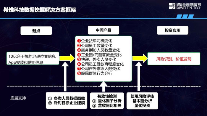 希维信息的起点是10亿台手机的地理位置信息、使用者APP安装和使用信息。这些数据是脱敏的,不涉及任何个人隐私,且是非结构化的。通过清洗和初步建模,希维从海量的非结构化数据里得到金融市场能够利用的统计信息,并得到一些中间产品,如企业货车司机变化、公司员工数量变化、商务到访人员数量变化、工业园/商圈客流量变化、快递、外卖人员变化、公司员工受教育程度变化、公司在外求职人数变化等。