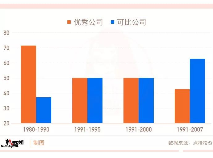 然而如下图,在此书出版的时候,大部分优秀公司在1980到1990年战胜了标普500指数,而可比公司中只有不到40%的比例战胜了指数。但是到了1991到1995年,这批优秀公司战胜市场的比例和可比公司一样了。如果把时间拉长,从1991到2007年,优秀公司战胜标普500的比例低于50%,而可比公司大约有70%比例战胜了市场。