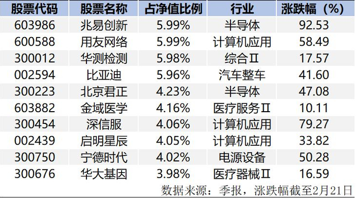 截至2月21日收盘,兆易创新涨幅超过92%,深信服、北方华创、安恒信息涨幅均超过70%。若黄兴亮未明显调仓,仅这几只个股对基金净值涨幅的贡献就接近20个点。