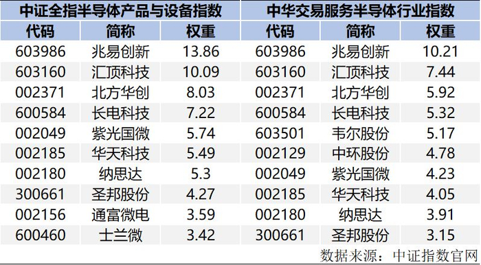 ▼附图:半导体指数与中华半导体指数前十大重仓股对比