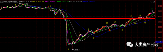 (3)上期上证综指结论指出本轮行情目前反转信号尚未产生,仍然定义为强势反弹,该观点做出一定修正。站在日线趋势角度,并未出现趋势上涨的信号,但是站在30分钟级别,目前由于图1中27-28以30分钟一笔完成2685.27-3058.90的上涨,其中未出现任何的30分钟笔调整,这是远超预期的力度。后续有较大概率会演变成30分钟级别的走势类型上涨,即a+(30分钟中枢)+b的结构。因而就此判断,30分钟本级别角度,目前不会出现本级别趋势性的调整,短期内的100点的下跌是可能存在的,但这最多是构造(30分钟中枢)+b结构的过程。