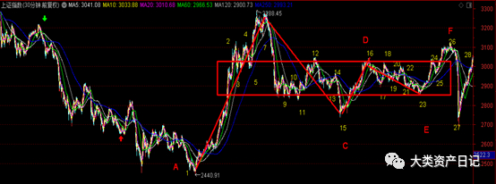 注:上图以30分钟级别为分解基准,黄色12345....等阿拉伯数字是30分钟K线分笔以及30分钟K线次级别走势类型(5分钟K线走势结构)进行的分解,红色ABCDEF是站在30分钟级别递归成日线级别的分解。
