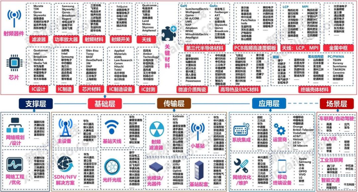 上游支撑层产业主要包括网络规划设计、网络工程,基础层产业主要包括芯片、射频器件、关键材料;