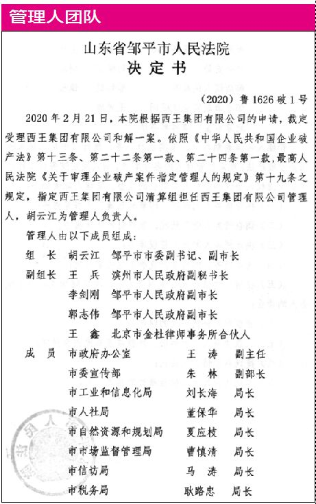 在法院发布的《裁定书》中,法院认为,西王旗下3家上市公司在高端特钢、运动营养等领域有较强竞争力,具备较高和解价值。并指定西王集团清算组担任管理人,邹平市委副书记、副市长胡云江为管理人负责人,邹平市政府副秘书长王兵等3人、及金杜律师事务所的一位律师共4人为副组长,其他成员则以当地政府多个部门的一把手为主。