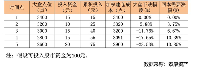 举个例子,假设在3400点的时候,投入资金15%,之后市场继续下跌到3200点,投入资金会推高到25%,也就是增加10%。那么如果继续下跌到3000点,比例推到45%,如果继续下跌,比如说一直到2600点,这个资金比例推到75%,这样一个建仓方法,就是一个金字塔建仓法。金字塔建仓法的好处主要有二:一是,市场下跌,心态平稳,因为并没有将所有的钱都投出去承受风险。二是,可以利用市场下跌不断摊低成本,化危为机。比如在这个例子中,只要市场回升13.85%也就是回到2960点,就可以打平成本,超过2960点就会有收益,从而帮助投资人在反弹中快速获益。