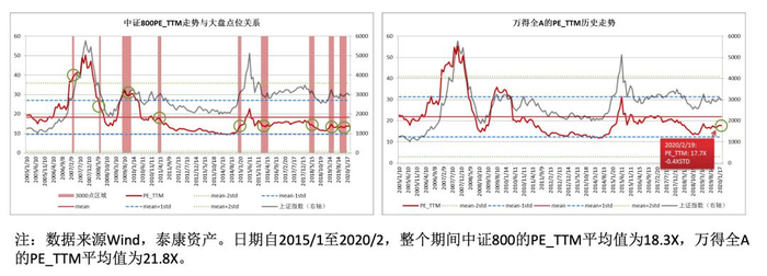 此外,还可以通过直接观察市场的估值指标——PE水平的高低来更判断股票市场目前的投资价值(注:关于市场最新的估值水平,投资者可以通过百度搜索到,或从万得或大智慧等资讯系统中查询得到。)从中证800历史PE走势图来看,过往PE均值水平维持在18倍左右。如果市场离开这个均值往下越低就代表着市场越便宜,相反代表市场越贵。目前市场在3000点附近,它的估值水平仅有12倍,远低于历史的均值18倍。
