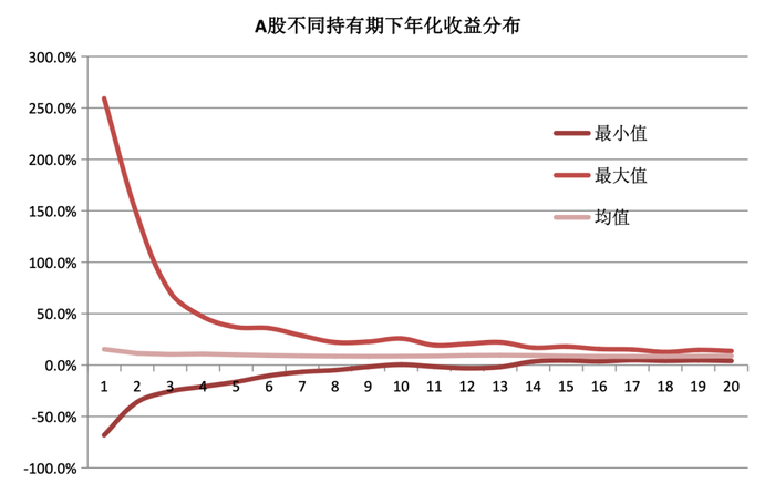 要用长钱的心态来投资股票市场的投资价值需要时间去兑现。投资股票市场的年化回报水平会伴随投资年限延长而趋于稳定,而短期内的投资回报会非常不确定,可能为正,也可能为负。