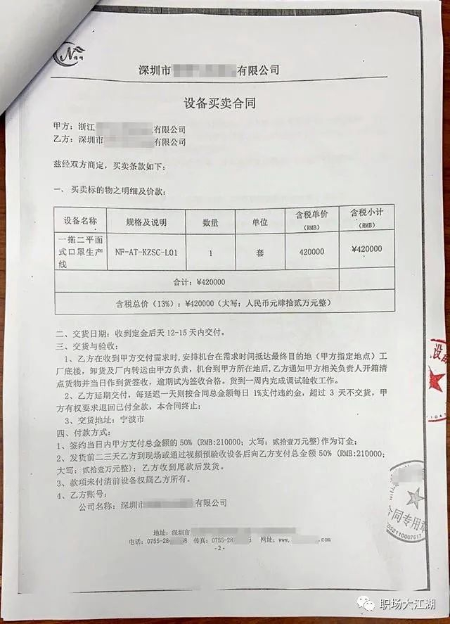 销售对我说,现在下单,50万元一台,15天后交货。看了一圈,没有比这家更靠谱的了,工厂也有1000多人,是个大厂,而且的确也做出了样机。于是,我就和他们签订了合同,买了2台,转账付完款后,就回到泉州了。