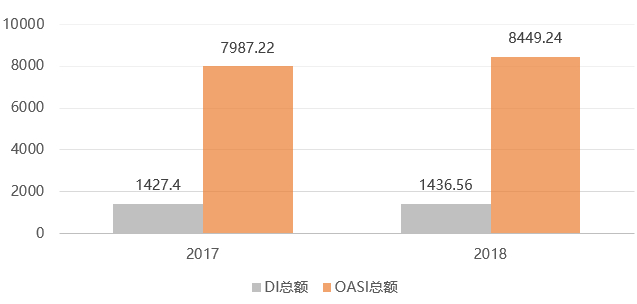OASDI计划由OASI(老年、遗属保险)和DI(残障保险)两部分组成,从人数和规模上看,OASI计划的相比DI计划更为主要。OASI针对退休工人及其家属和已故工人的遗属,DI则针对残疾工人及其家属。规模上,OASI基金提供的福利金额占OASDI比例约为85%,DI约为15%。人口老龄化逐渐加深,所以从OASI领取福利的人数持续增长,而领取DI福利的人数下降。