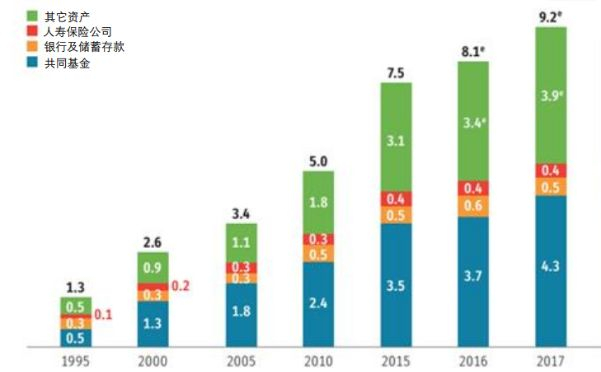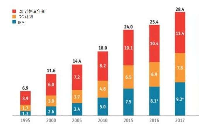 美国养老金的规模一直与其GDP 体量相当, 2017 年养老金总规模为 28.4万亿美元,与当年 GDP 的比值为 1.5 倍。