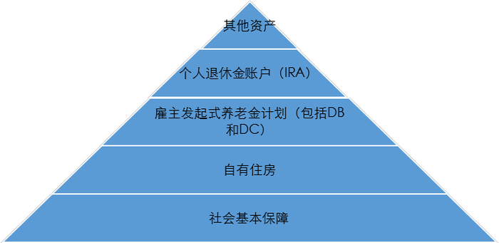 美国养老保障体系是一个有着五层结构的金字塔,也可将它分为简单的“三大支柱” ,第一支柱为社会安全福利即美国的基本养老保险;第二支柱是雇主或政府的退休金,类似于国内企业年金的概念;第三支柱是以IRA 为代表的个人缴费计划。