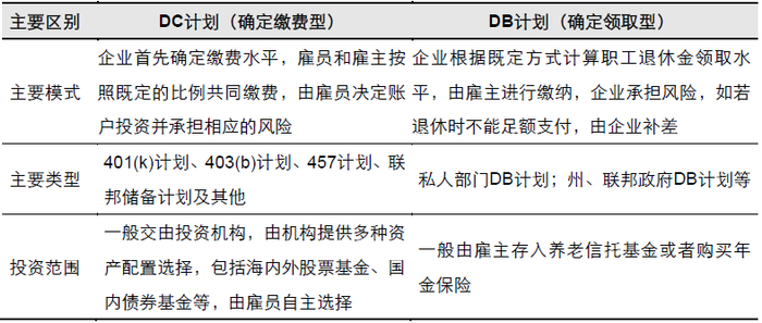 一般也称为由雇主发起的养老金计划,主要包括了DC 和DB 两种模式,在过去30 年间,DC 计划资产增长速度远超 DB 计划, DC 计划资产总额占两者总资产比例从 1987 年的 28%增长到 2017年46%, 2018 年占比超过了 50%。DC 计划和 IRA 一样均是以个人账户为基础的储蓄,在养老金中份额很大, 2018 年二者占比分别为 27%和 33%,合计占比 60%。目前两者的规模不相上下,主要区别见下表。