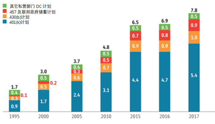 DC 计划提供给雇员一个退休账户,账户资金由雇主、雇员缴纳的金额加上投资损益,减去税收递延得到。DC 计划又可以分为401(k)计划、403(b)计划、457 计划、联邦储备计划及其他,各类规模见下图。