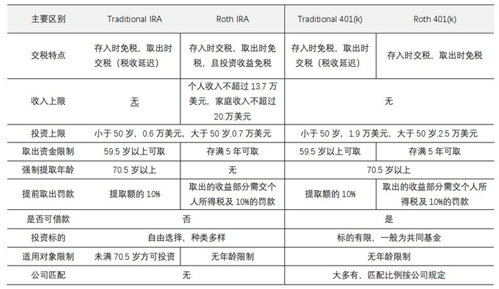 IRA 的投资标的相对 401(k)有更多的选择,它基本等同于一般的证券投资账户。IRA 和 401(k)根据交税时间, 都分为 Traditional 和 Roth 两种。Traditional 是存入的时候免税,取出的时候交税,而 Roth 则相反。