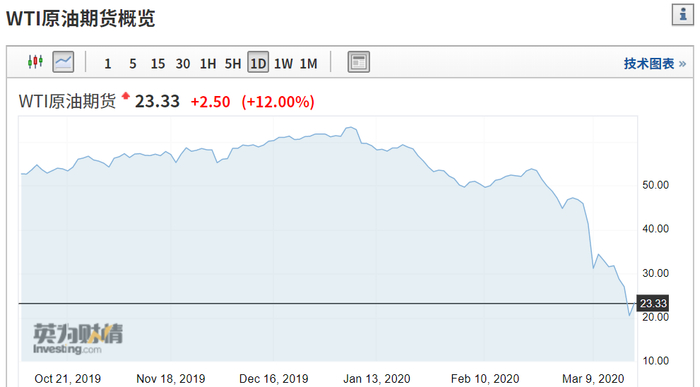3月5日,一场全球石油减产协议谈崩,彻底击垮了石油价格。短短11个交易日,国际油价惨遭腰斩,累计暴跌超50%,截止发稿,WTI原油价格仅剩23.33美元/桶。