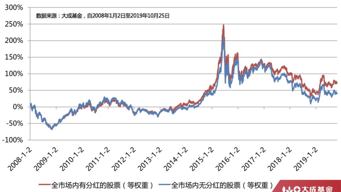 2008年以来,有分红的股票组合长期收益明显高于无分红股票组合。尤其是从2014年开始,有分红股票的整体优势越来越大,显示出红利策略更加有效,也说明投资者越来越成熟。