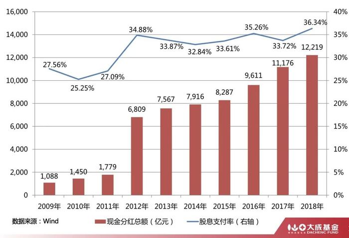 A股上市公司现金分红总和与股息率逐年增加