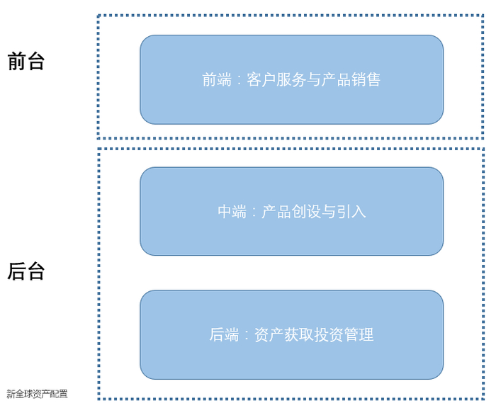 财富管理在美国的经营机构倾向前台与后台(包括中端和后端)分离,产品经理与客户经理分设。我们沿着这条主线 ,分别看看前端、中端、后端这三块代表性小霸王。