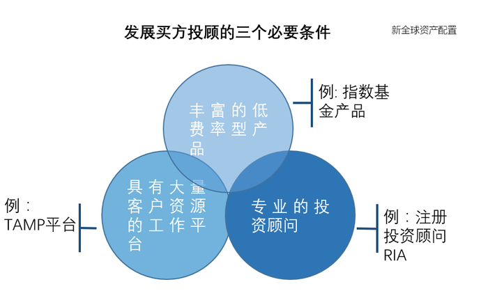 在成熟的资本市场中「资产管理—投资顾问—产品销售」是财富管理业务链的三个高度依存的环节。从美国买方投顾模式的发展历史看,买方投顾的发展离不开三个必要条件:一是丰富的低费率配置型产品,二是具有大量客户资源的工作平台,三是专业的投资顾问。