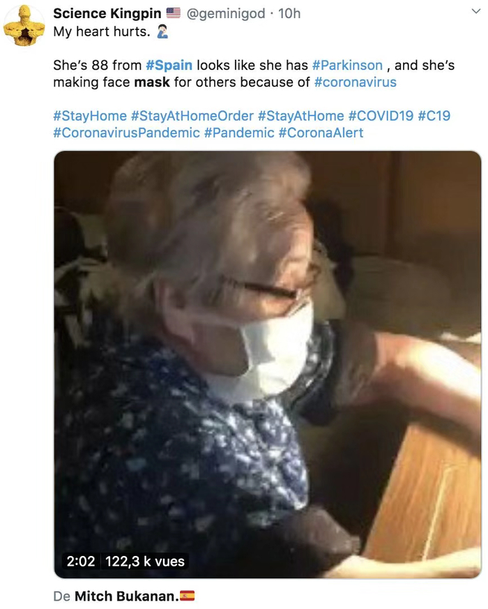 88岁的西班牙老奶奶在家自制口罩,并做出更多的送给他人 图片来源:twitter